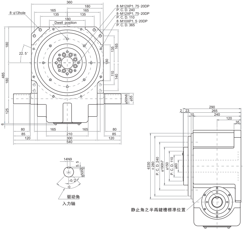 此系列机种之尺寸设计特性与凸缘型功能想啥,于驱动运转上可承载超大轴向负载及垂直径向压力,在输出端有一凸起固定盘面及大孔径空心轴,可搭配设置功能、静态自动化周边设备,可将动力源之电、油、气管路置于空心孔内,此系列机种广泛用于重负载、直接自动化设备之各类机构及产业机械,作同步自动化间歇运动。
